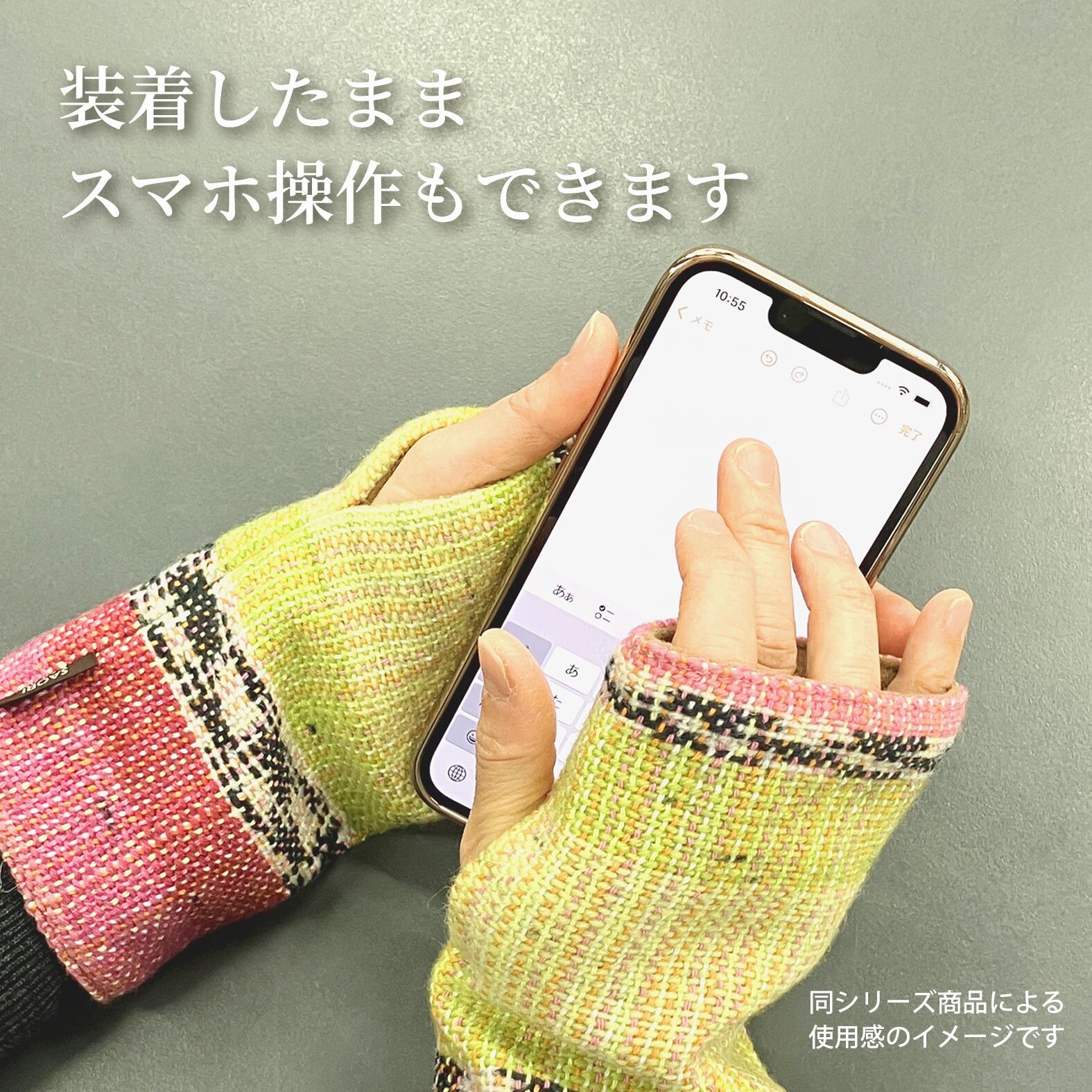 指先が使えるので、スマホやタブレットの操作をしながらも、手首をすっぽりカバーしてくれます。